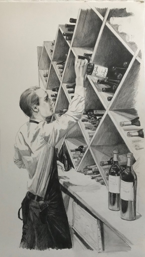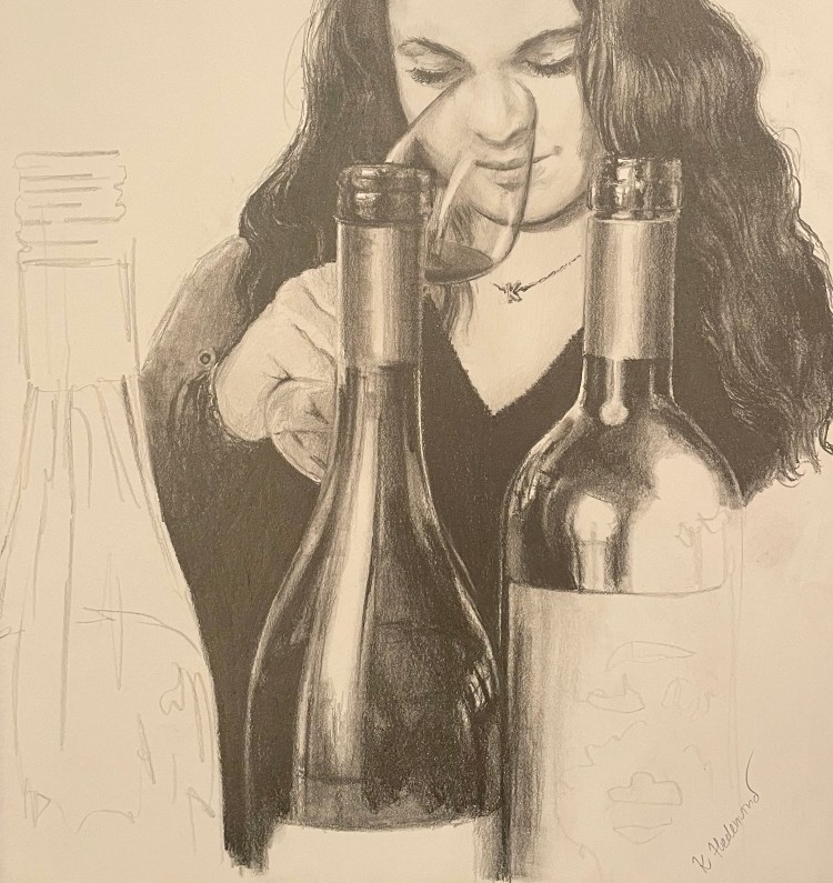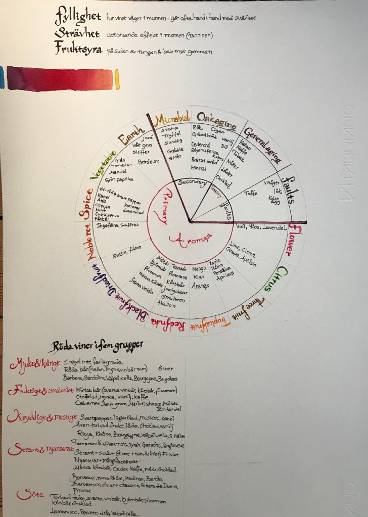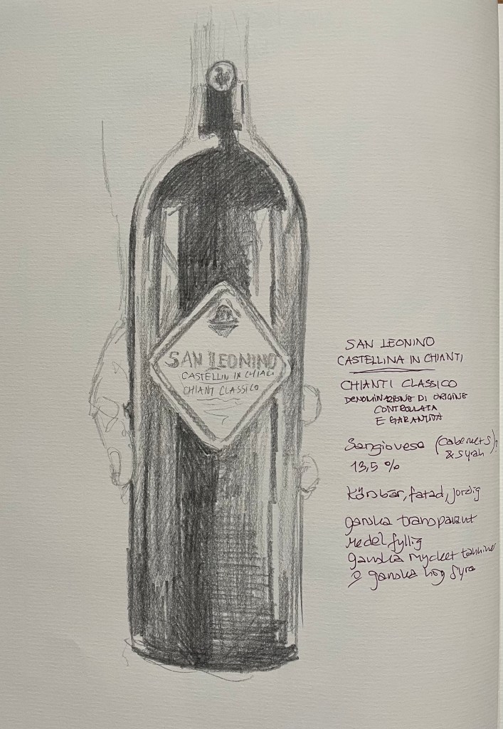 Mitt vinintresse tar sig flertal konstnärliga uttryck. Jag har anteckningsböcker helt dedikerade till själva inlärningen. Jag har skissböcker där jag tecknar ner allt vin jag druckit (jag är inne på min fjärde). Samt förstås olika teckningar och målningar med vinteman.