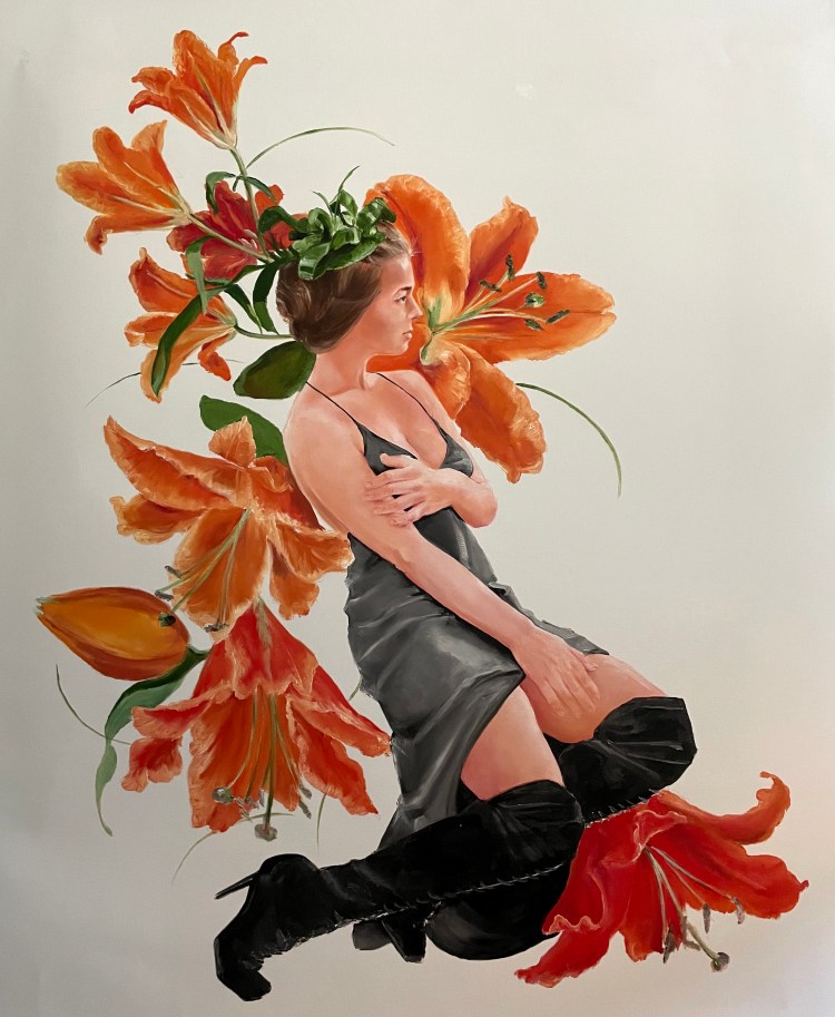 Sommaren 2021 hade jag en målarperiod inspirerad av min dåvarande pojkvän som älskar blommor. Det blev stora oljemålningar där personerna är nästan lifesize med enorma liljor och pioner.