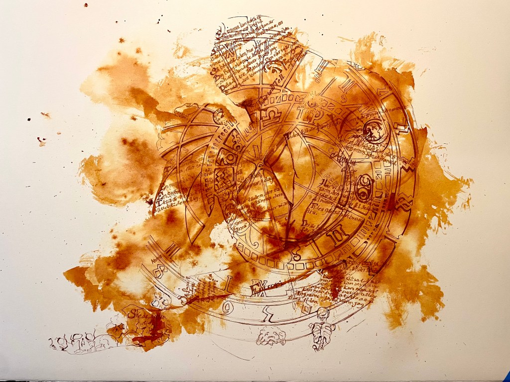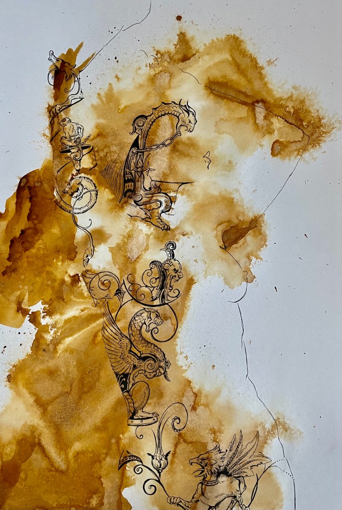Oftast när jag arbetar i en stil så håller jag mig också till ett material. I detta fall tusch mestadels i flytande form.