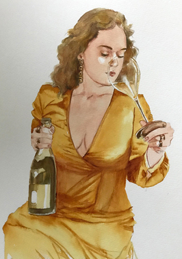 Denna tavla har planerats minutiöst sedan lång tid tillbaka. För nästan två år sedan började jag och min Amanda (som är modellen och varit med i hela processen) att diskutera idéen. Vi valde fyra champagnehus som vi ville ge en karaktär och personlighet till. Vi diskuterade allt från pose och attityd, till kläder och smycken samt omgivning och färgskala. Och inte minst glas! Jag gjorde några förstudier i akvarell.