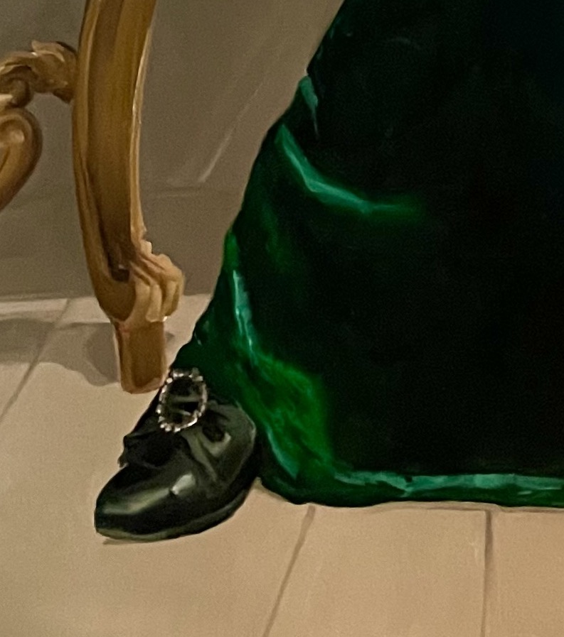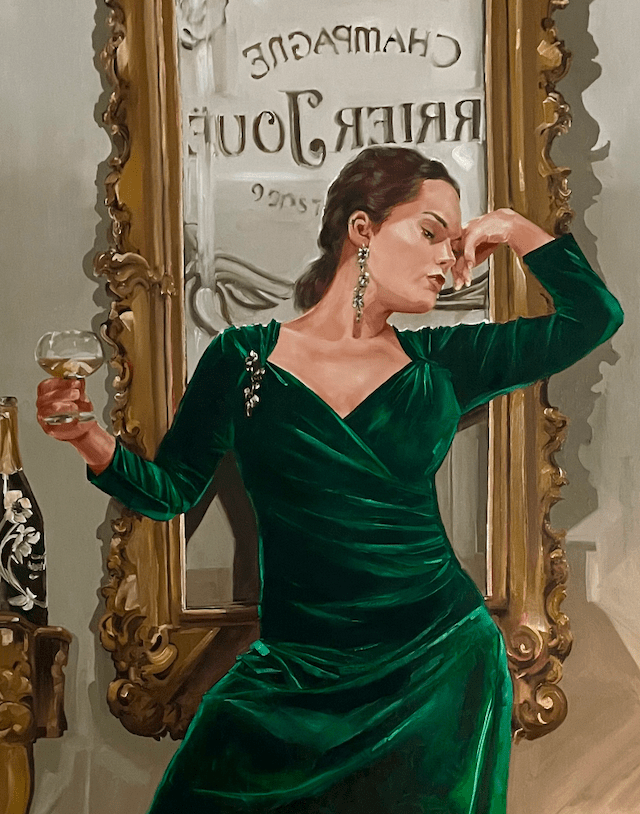 Belle Epoque förkroppsligad är böljande och mjuk. Glaset är ”Marie Antoninettes bröst” som man numera anser vara olämpliga att använda, men som estetiskt passar in i tavlans känsla. I spegeln reflekteras husets logga. Smyckena är från Maria Nilsdotter; de är som gjorda för Belle Epoque.