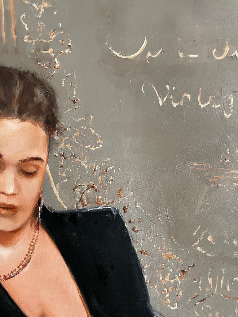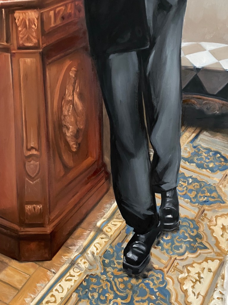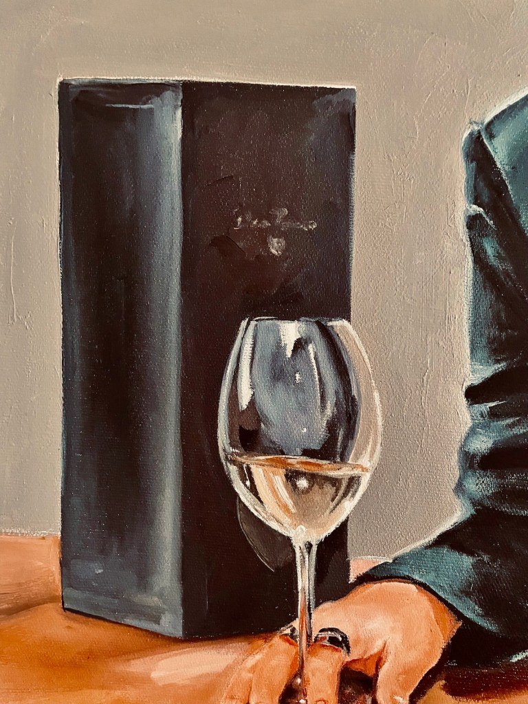 Denna gång är det den klassiska prestigechampagnen Dom Pérignon som illustreras. Dom Pérignon har haft som sin klassiska målgrupp män och ”old money”, vilket jag har försökt att illustrera. På väggen kan man ana loggan och även ett årtal. 1990. Jag återkommer till det. På möbeln finns ett annat årtal: 1743, vilket är året huset Moët & Chandon grundades. Alltså huset som tillverkar Dom Pérignon. Längre ned på möbeln syns också formen på etiketten. Och på bordet står förstås en presentkartong som kommer med champagnen.