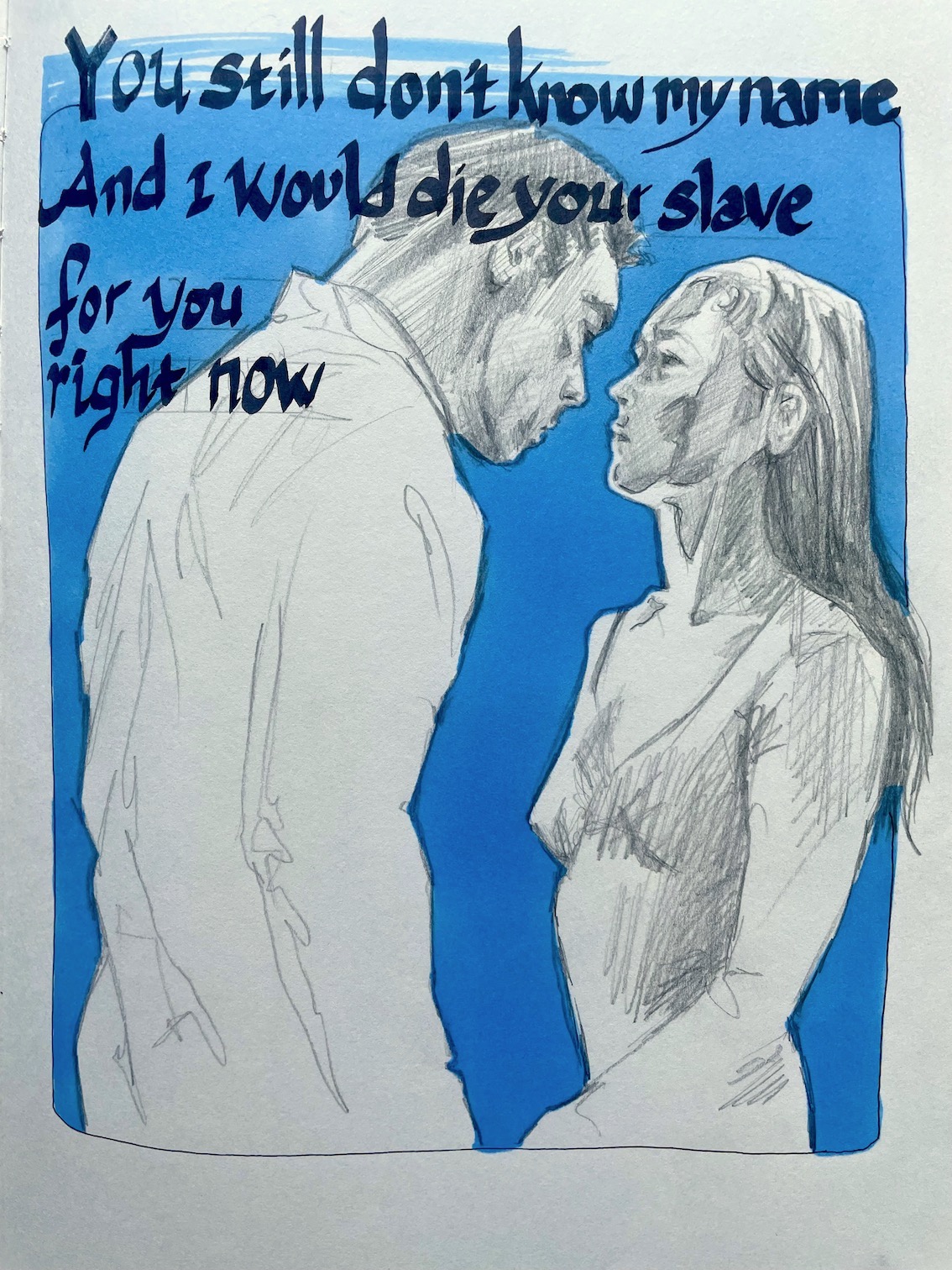 Regel 3. Den sista regeln jag följer är att inte teckna det uppenbara i texten. ”And I Would Die Your Slave” kommer inte att bli en teckning på en slav.