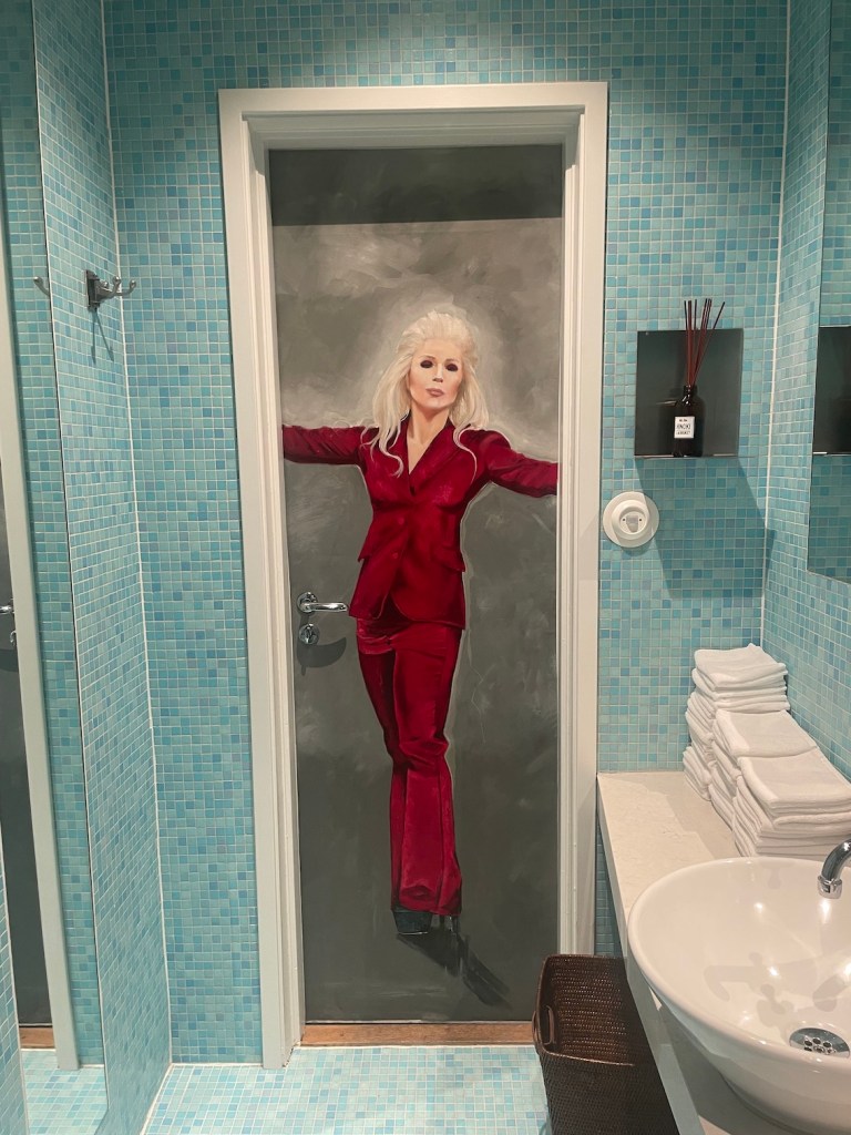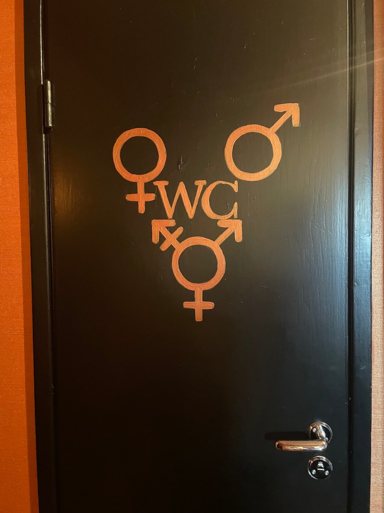 Jag har målat om dörrarna på toaletterna på Bomans övervåning. På insidan av den ena dörren är lady Gaga i kostym och på insidan på den andra dörren är Harry Style i klänning. På utsidan (på bägge dörrar) har jag målat tre symboler kring ordet WC. En för kvinnor, en för män och en för binära.