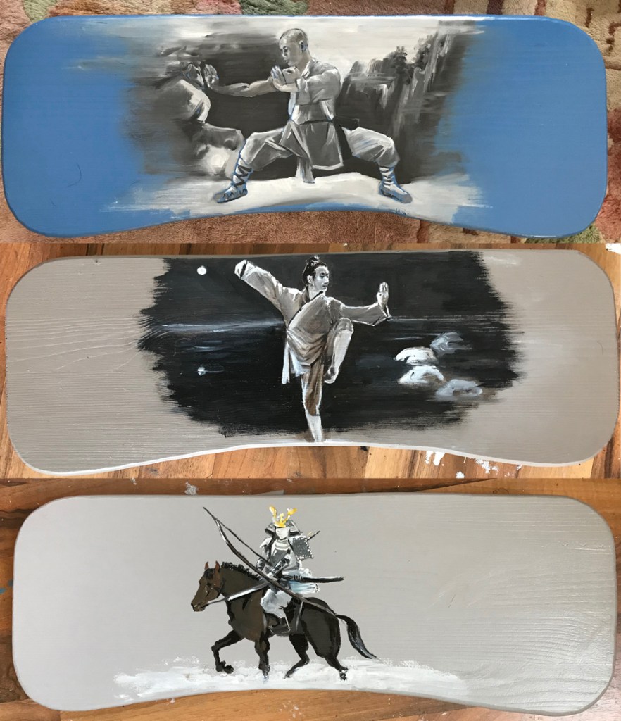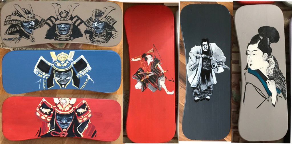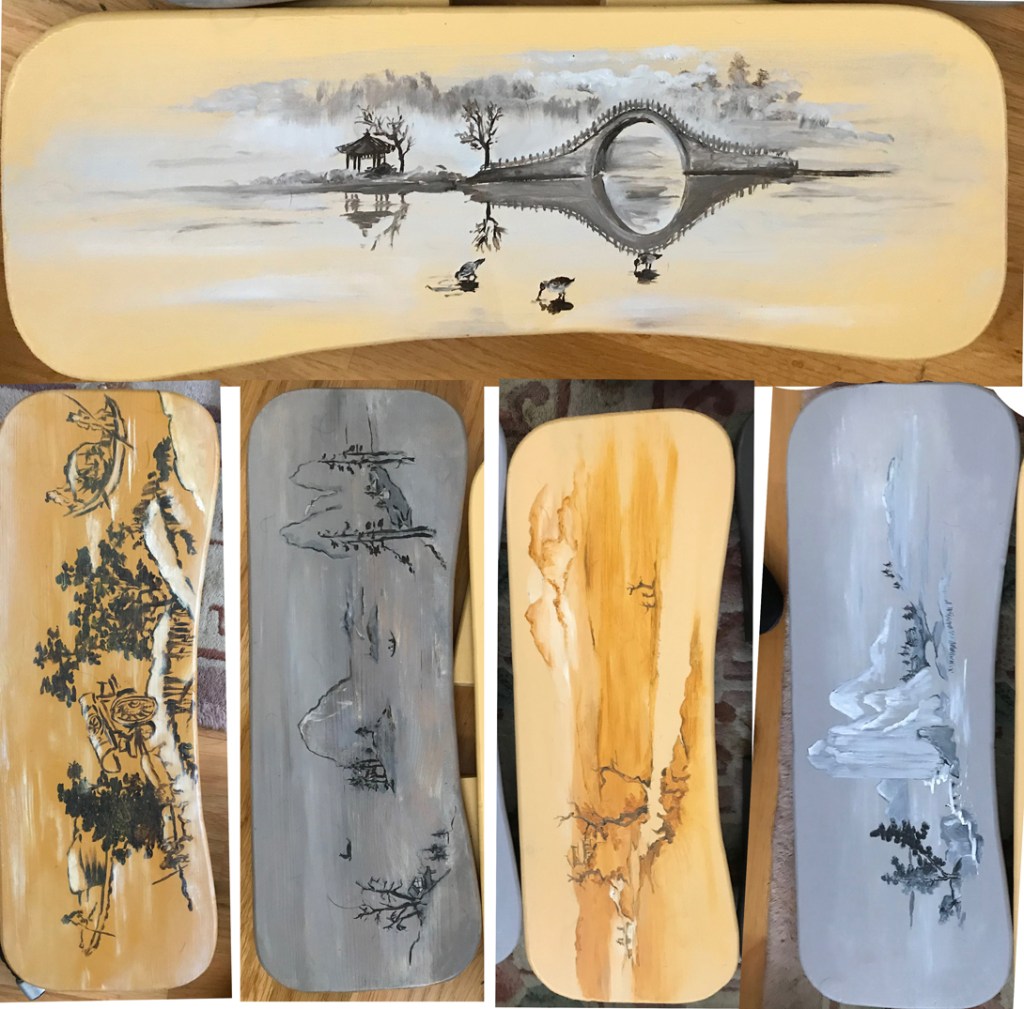 2018 bestämde vi oss för att ge alla vuxna en meditationspall (barnen fick andra saker) En av våra elever tillverkade delarna till pallarna som jag sedan grundmålade och dekormålade. Vi satte sedan ihop dem tillsammans. Det blev 60 stycken. Här är några av dem.