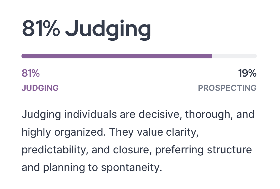Jag ser Myers-Briggs som en intressant utgångspunkt man kan använda för att diskutera personligheter och människor man känner. Som en väg att försöka förstå sig själv och andra. Jag tycker också att själva resultatet är mindre intressant än frågorna. Det är i frågorna man verkligen kan reflektera över sig själv och andra.