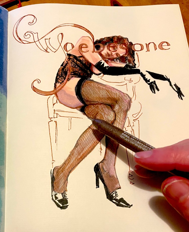 Burnt Sienna och svart och det magiska ordet Woebegone (bedrövad) drev fram denna teckning.