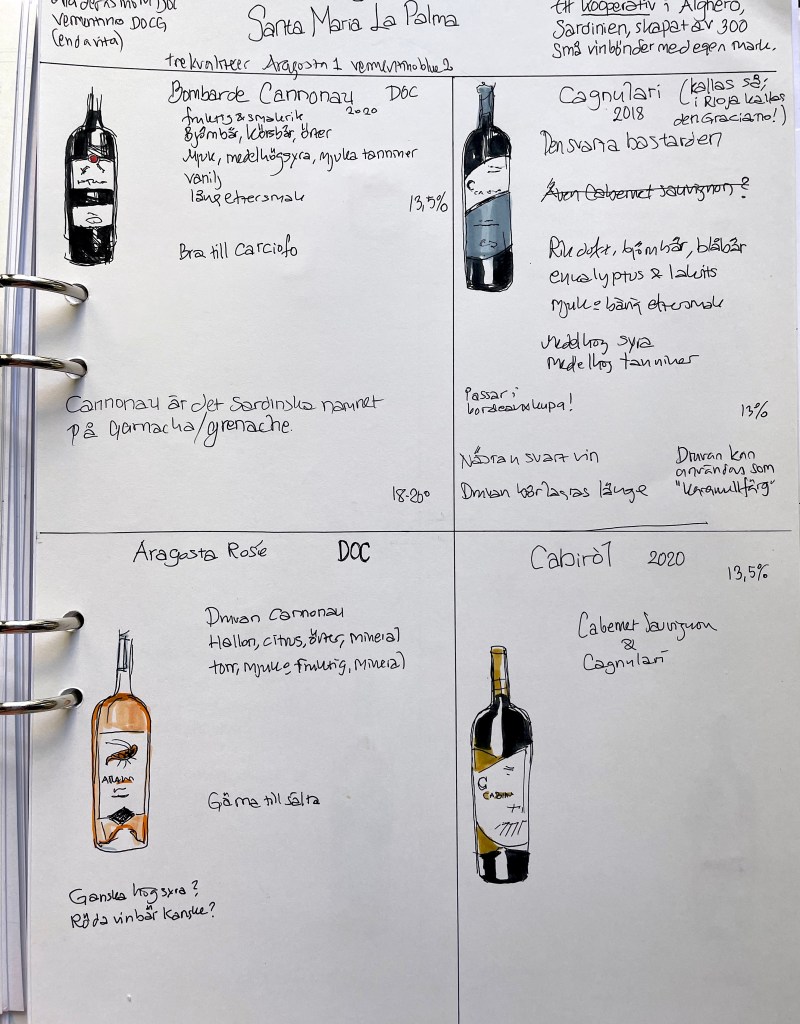Allt vin vi säljer på baren tecknar jag ner och googlar om. Det har kommit att bli över 100 sidor i min pärm. Det är ytterst enkla teckningar som enbart syftar till att minnas.