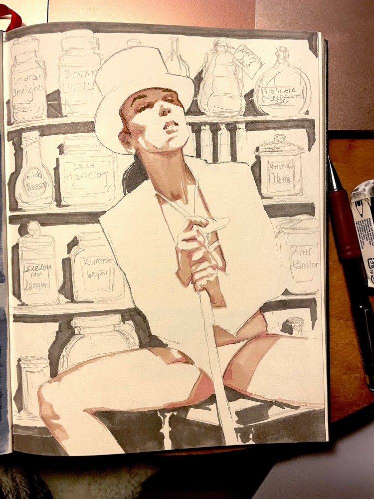 Sid 23 igen fick jag inte ett ord, utan många. Jag hade skrivit ner orden för att välja ett alternativ men när slumpen valde dem tyckte jag det blev roligt att behålla dem alla. Så där i hyllan bakom kvinnan står flaskor med mediciner mot alla de värsta åkommor man kan ha.