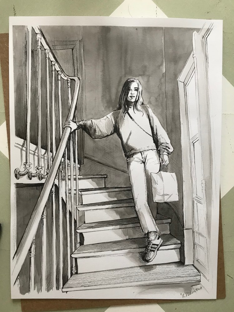 Ögonblick illustreras kanske bäst i en miljö som inte är den givna, eller i en situation som känns oplanerad. Och med en gest som inte är konstlad. På teckningen är munnen lite öppen, kanske är det ett ögonblick mitt i en mening? En hand som är i en rörelse och en situation där vi sällan vill bli stannade i tid.