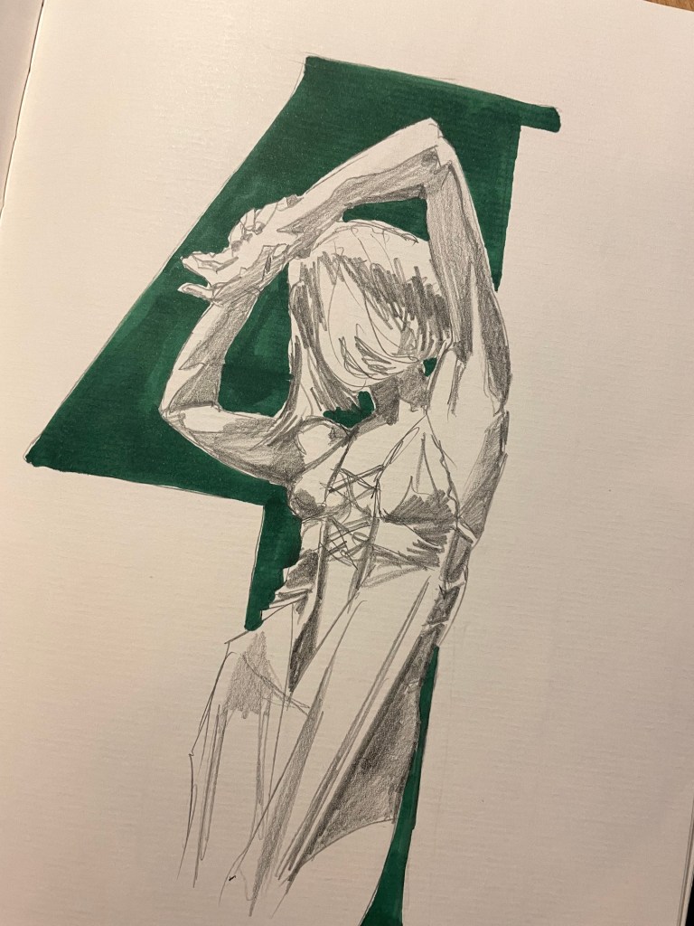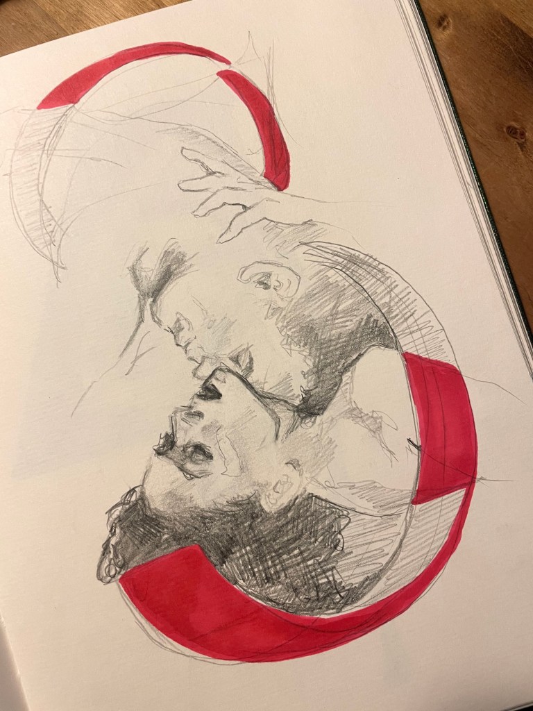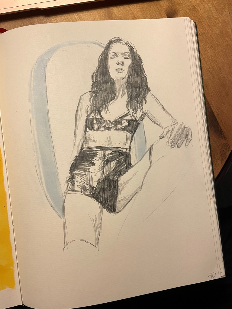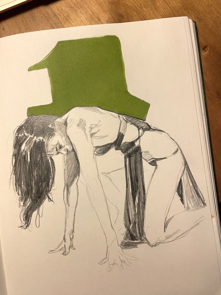 Det var en tillfällighet att formen på teckningarna i allmänhet faktiskt såg lite ut som den aktuella siffran. Speciellt två, tre och fyra. Och beträffande siffran ett tyckte jag det blev så bra att ställa en tung siffra på hennes rygg. Men kanske läser jag in formen efteråt för att vi människor älskar ju att se mönster även där det egentligen inte finns mönster. Kanske hade en annan skiss kunnat bli lika bra? Lite så har jag tänkt genomgående i denna skissbok. Man har ofta en förmåga att tycka att det blev rätt bra vilket val det än faller på.