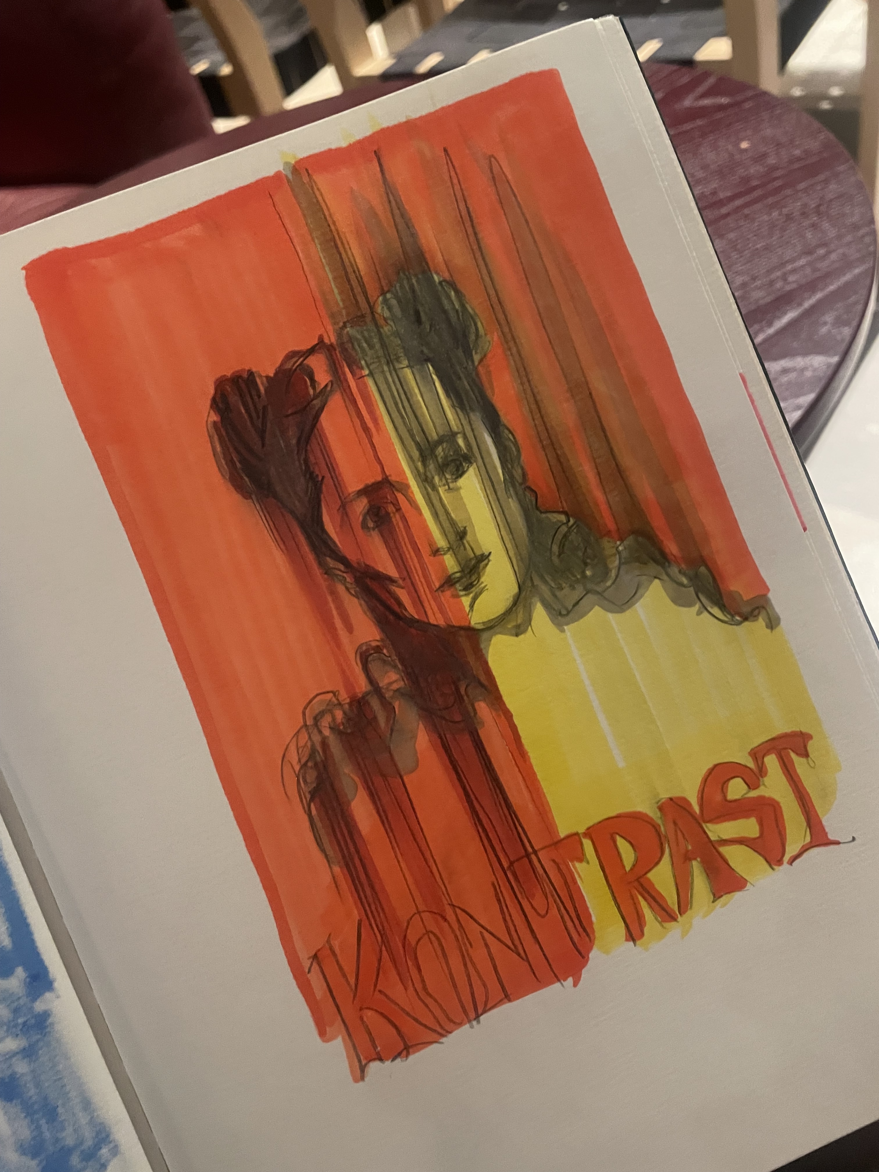 Nu känner jag något helt annat. Jag måste erkänna att kvalitén på mina sista bilder är låg. Jag ville bli klar. Jag experimenterade lite med gouache – något jag i princip aldrig gjort tidigare. Jag köpte ett litet set med primärfärgerna för att testa.