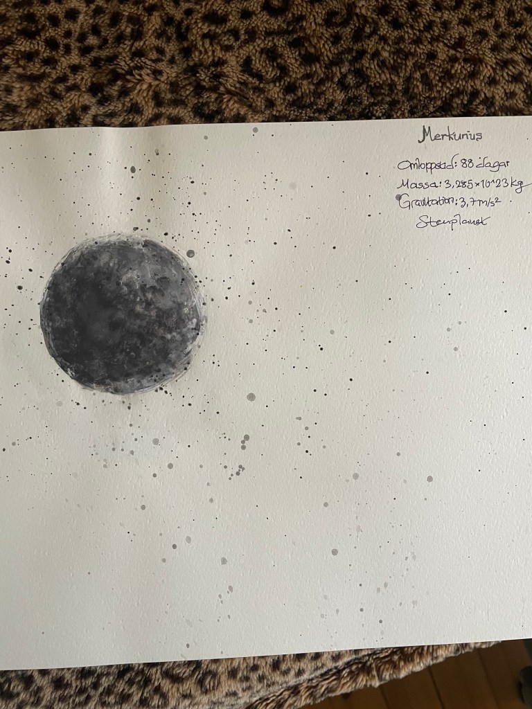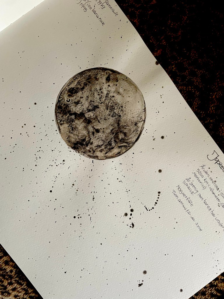 Jag har aldrig gjort den klassiska stjärnhimmel-målningen för den har känts lite för använd och kanske lite patetisk men jag har gjort många teckningar där man kan ana mitt intresse. Och förstås har jag en hel skissbok dedikerad till solsystemet och Universum. Men jag har mycket kvar att göra i den någon gång i framtiden när jag prioriterar det. Men här är några smakprov.