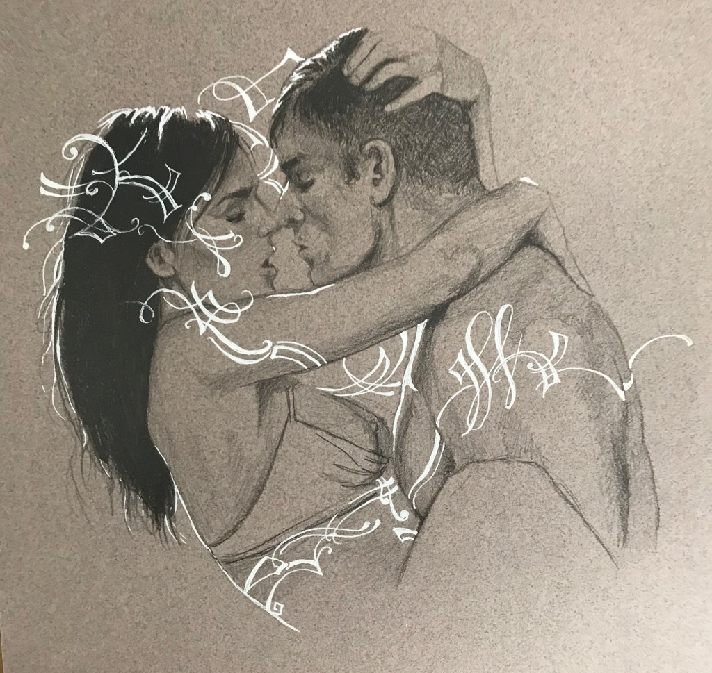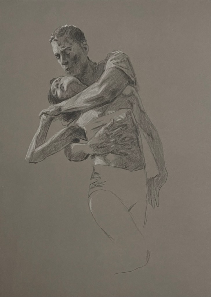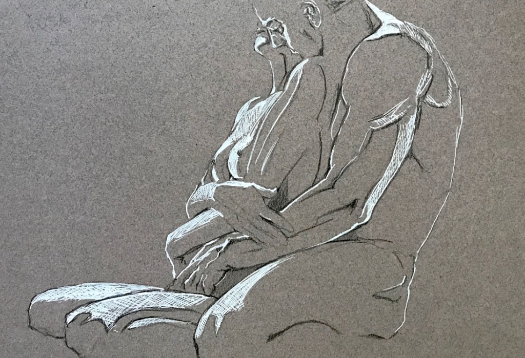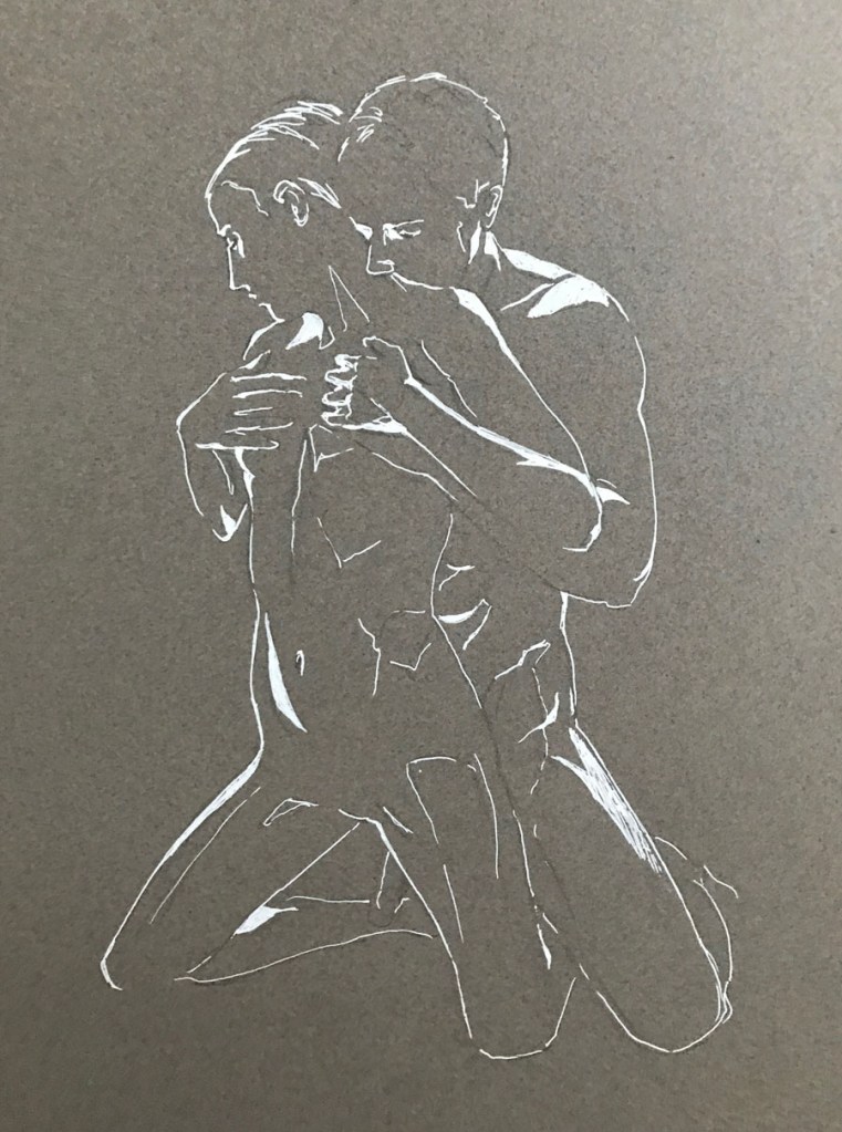 Jag laborerar med blyerts och vit penna på färgat papper. Att arbeta från en neutral grund istället för en vit grund tvingar fram ett större fokus på ljusdagrar och mörker. Denna serie fokuserade på motiv som var lätt erotiska eller kärleksfullt ömma. Men motiven stod egentligen i bakgrunden för i mig där och då. Det var ljus och skugga som stod i centrum för denna bildserie. Och de sista bilderna är ganska lekfulla.