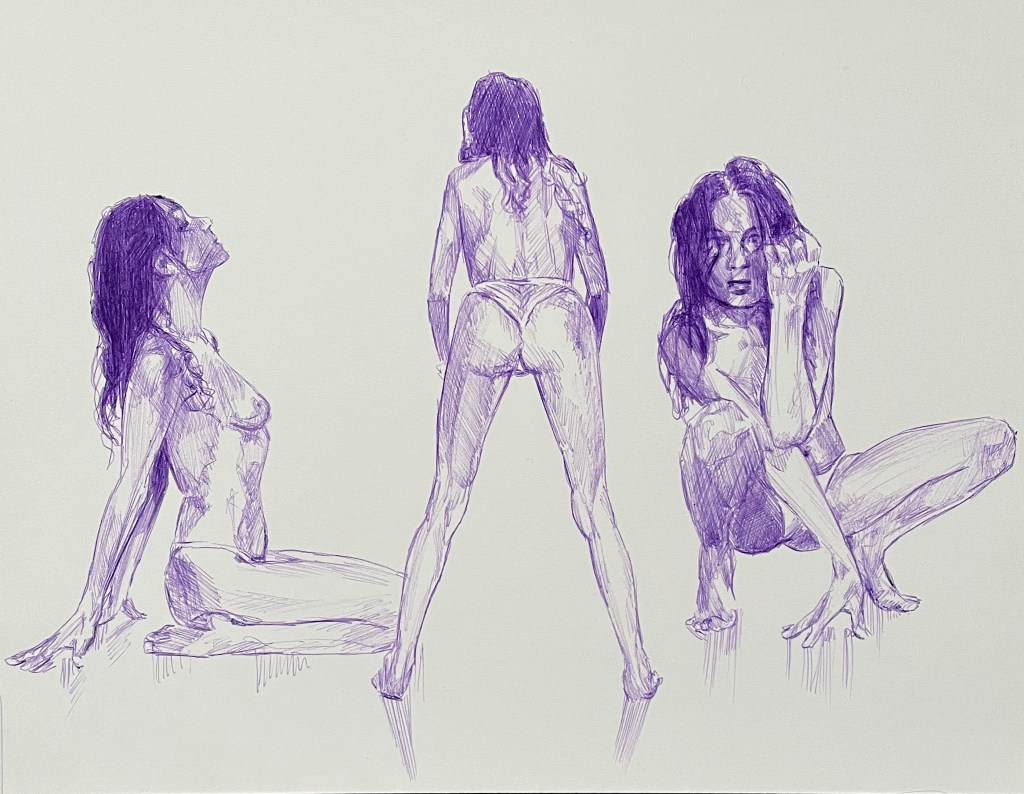 Jag förälskade mig i en helt vanlig BIC-penna. Ni vet, den där kulspetspennan med fyra olika färger. Efter att ha tecknat intensivt med endast rött ville jag prova andra färger men i samma stil och motivval. Jag provade den blåa men ogillade resultatet så jag slängde teckningen. Jag hittade en ny BIC-penna med andra färger. På den fanns cyan, lila och rosa (samt grön men den använde jag aldrig).