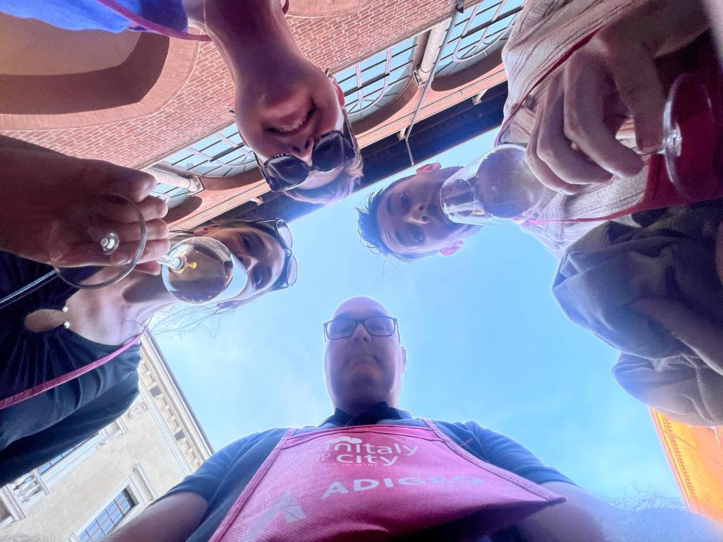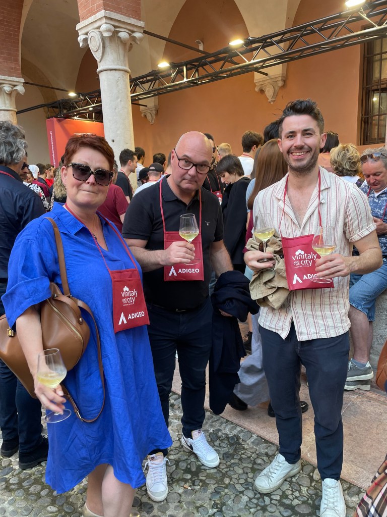 David och jag är bjudna på denna vinresa av Catarina och Hans för att bland annat besöka vinitaly, som är en stor vinmässa som årligen hålls i Verona. Men redan dagen innan mässan hålls en vinitaly City, där producenter står i små stånd längst gatorna i staden och man köper sig biljetter som sedan kan byta mot vin. Man får också en liten röd påse som man kan hänga runt halsen och ett plastglas som kan placeras i påsen.