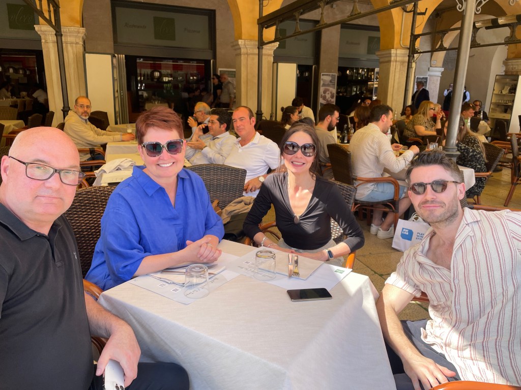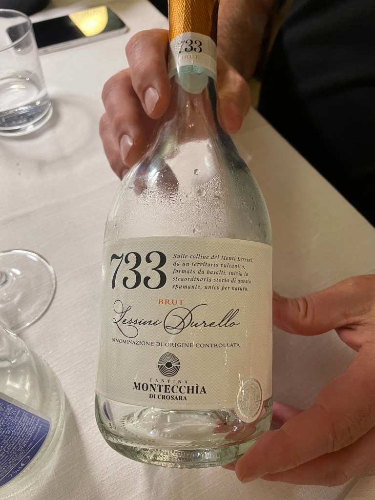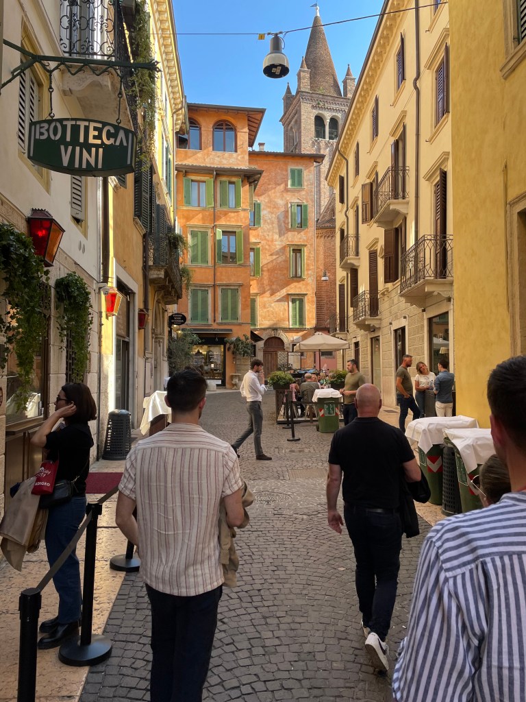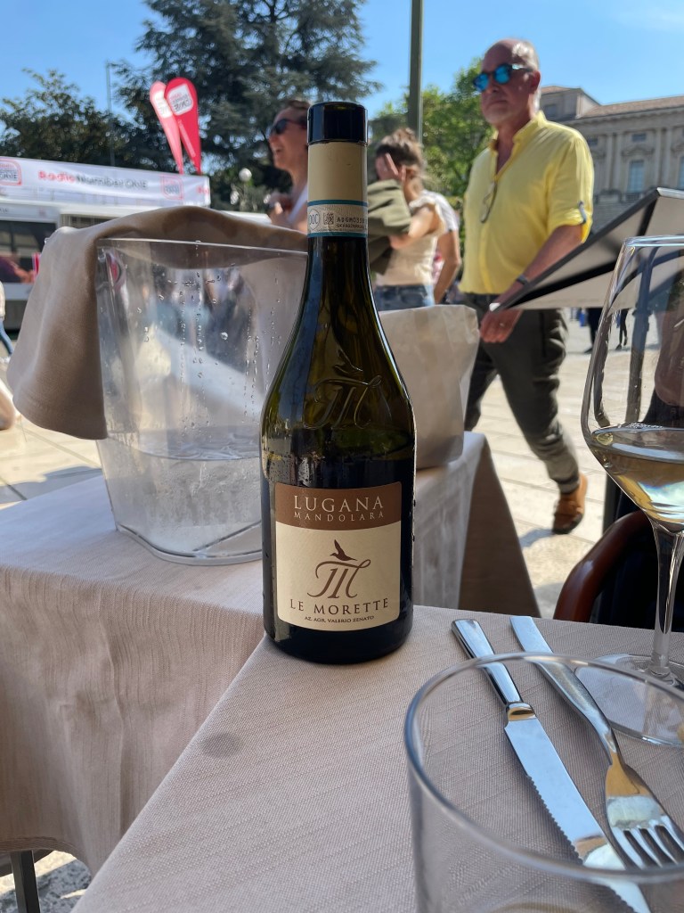 Min kollega David och jag gjorde sällskap på flyget till Verona där vi blev upplockade av våra chefer Catarina och Hans. Vi började med en lunch inne i Verona och där drack vi förstås en Lugana. Efter lunchen gick vi till en liten bar i en gränd. Mittemot baren stod deras soptunnor på lång rad. De hade lagt vita dukar över soptunnorna och på så sätt förvandlat dem till barbord. Ett av dessa ”bord” var ledigt så vi tog ett glas Franciacorta där.