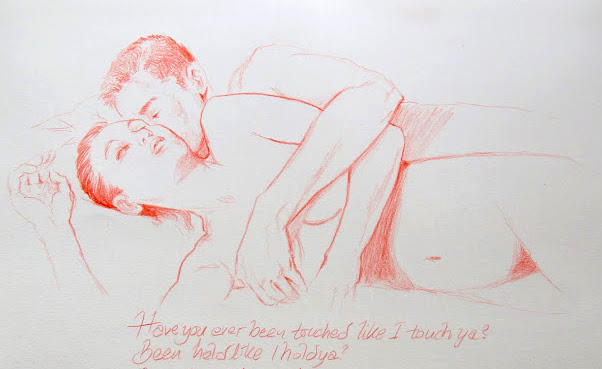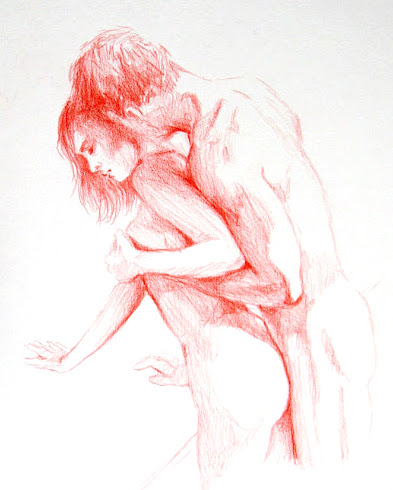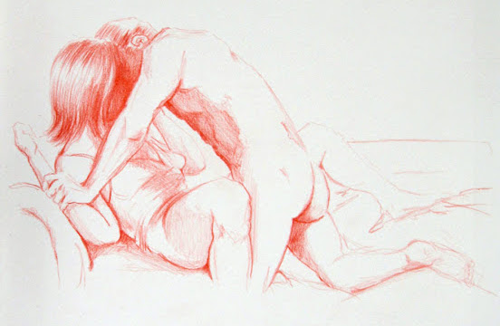 Dessa skisser är gjorda med röd krita. Det finns plats för många toner och språk i erotik. Ibland är det Mozart, ibland är det Race Against The Machines.
