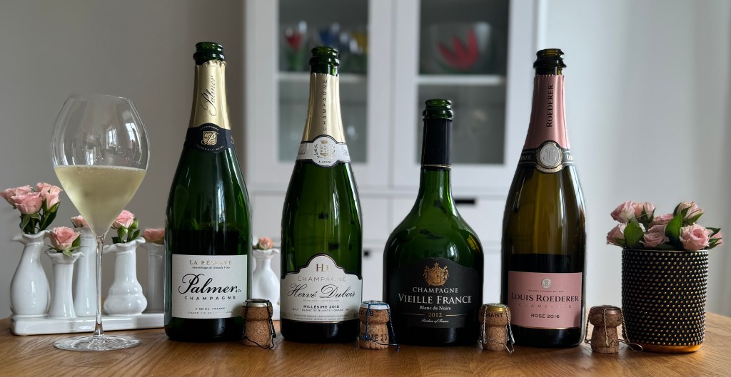 Den fjärde gången (igår) provade vi fyra champagner. En brut N/V (Palmer), en blanc de blancs (Hervé Dubois), en Blanc de noirs (Vielle France) och slutligen en rosé (Louis Roederer).