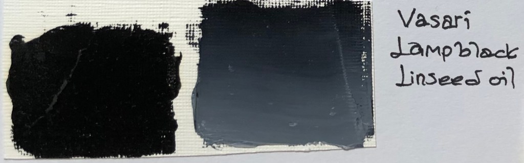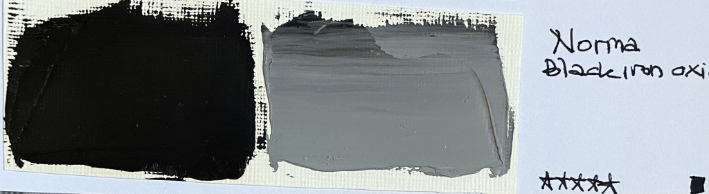 PBK11 är den svarta färg som brukar rekommenderas att användas som undermålning eftersom den torkar fort (har mindre olja). Det är en syntetisk färg (och brukar vara ett vegan alternativ) till skillnad från de ovan nämnda kolbaserade färgerna. Den kan vara varm eller kall i sin underton.Den är inte staining men den är granulerande (alltså att den inte uppfattas som slät utan får en struktur). Den kallas oftast järnoxidsvart eller mars black. Jag har Beckers järnoxidsvarta i linolja, Old Hollands Mars Black, Michael hardings Vine Black (som är PBK11) samt en Norma ironoxide alla i linolja.