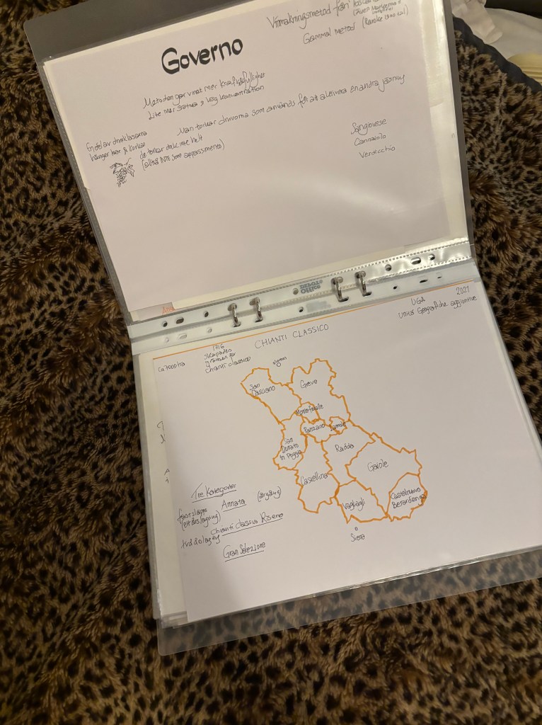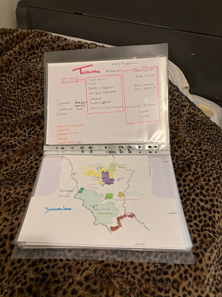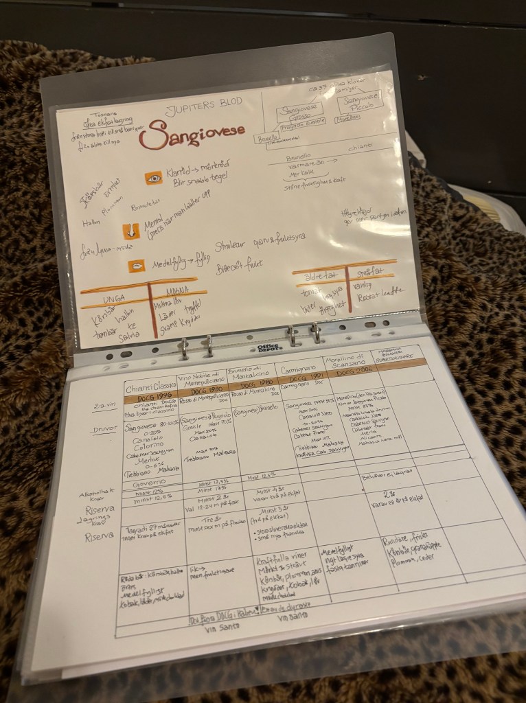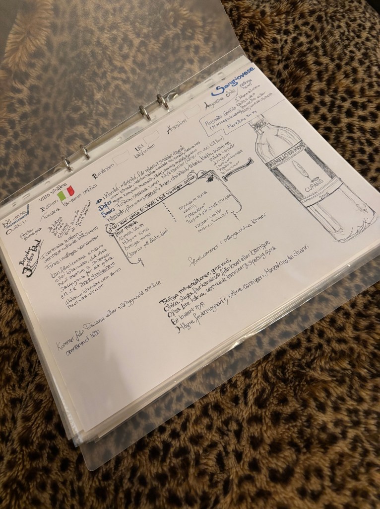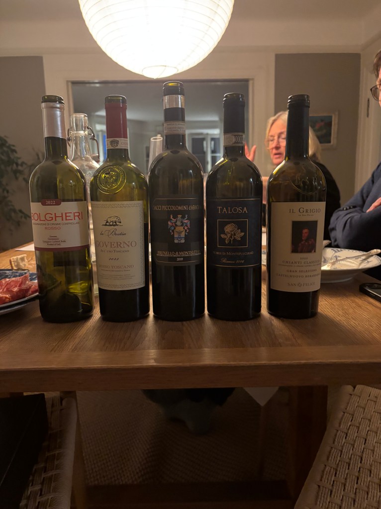 Vi har en liten vinklubb ihop. I höstas var vi på en Chiantiprovning tillsammans, men framför allt anordnar vi egna vinprovningar. Vi turas om att hitta på ett tema och köpa in vinerna. Igår hade jag köpt och förberett en vinprovning på tema sangiovese/vin från Toscana.
