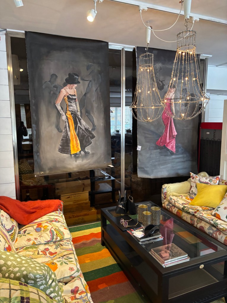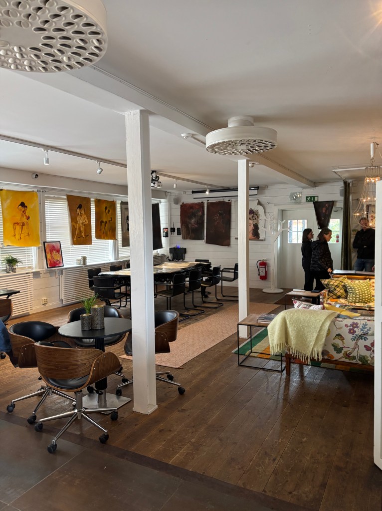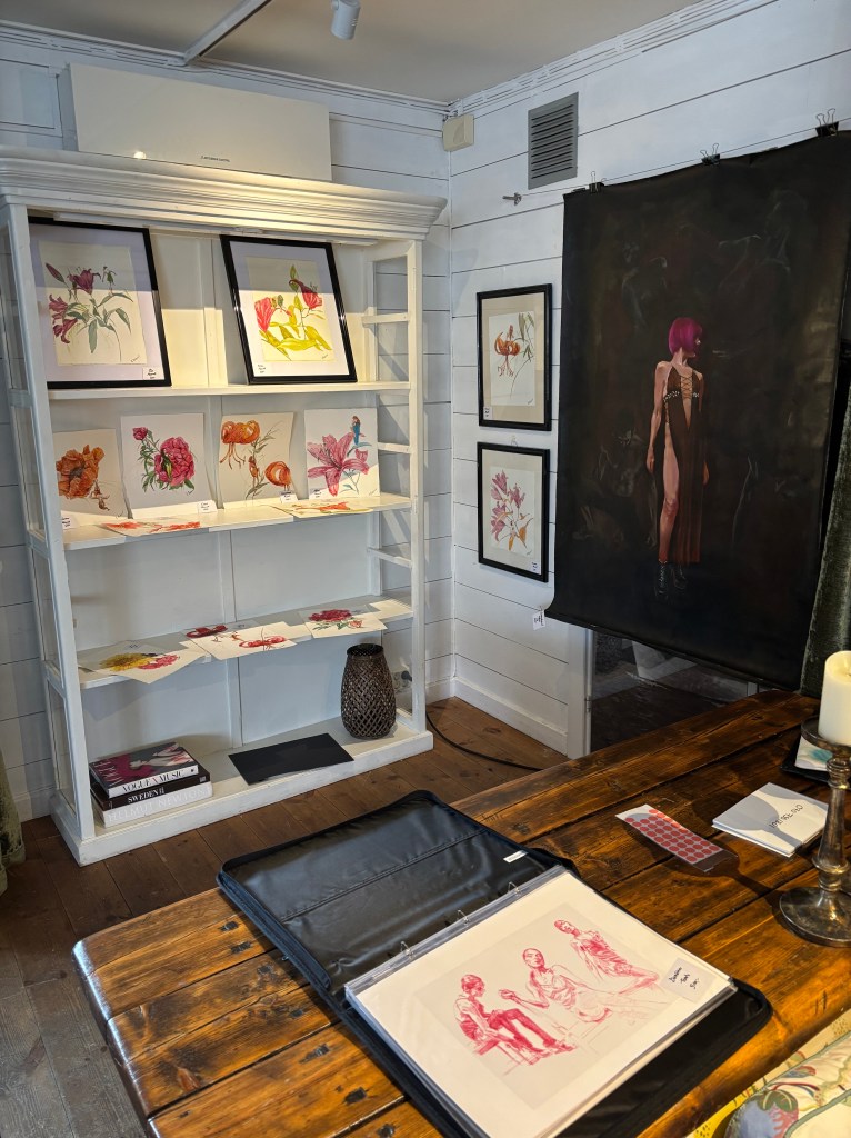 Det är roligt att stå här och jag är förstås tacksam. Mest tacksam gentemot Kristin på Bomans. Men samtidigt undrar jag om det inte får bli sista gången. Kanske är jag färdig med detta. För som jag släpat saker (jag tar så mycket jag förmår på bussen och t-banan) och nu ska ju allt jag inte sålt hem igen. Och hittills har jag bara sålt saker som inte gör så stor skillnad i vikt och storlek. Önskar att någon ville köpa mina stora målningar (men som alla säger – de kräver en herrgård). Ja, jag vet, jag borde inte måla så stort. Kan liksom inte låta bli…