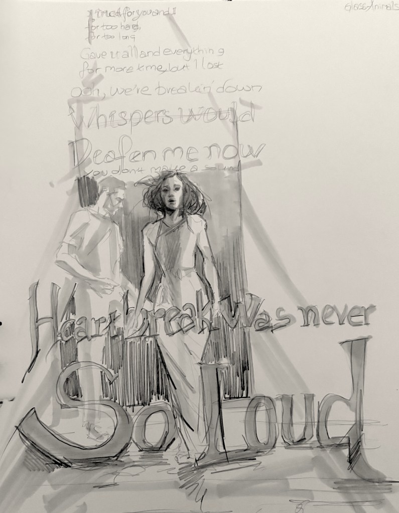 En skissbok är just det, en bok man skissar i. Provar ideér utan kravet på att lyckas. Jag ville illustrera hur låten börjar med att smyga sig fram för att bli starkare och starkare. Den saknar klassisk refräng- vers den bygger istället på en eskalering. Låten jag talar om är Glass Animals It’s All So Incredibly Loud.