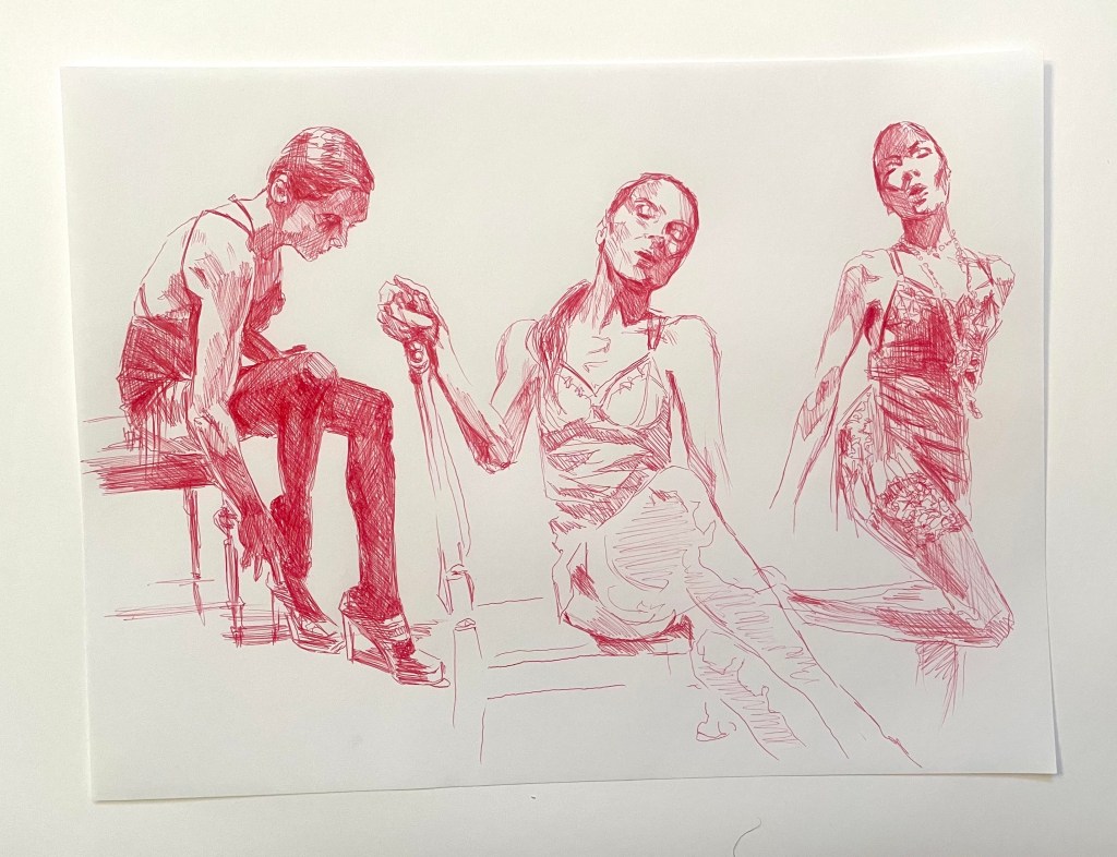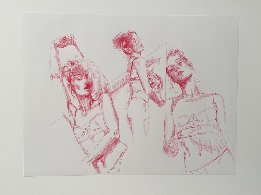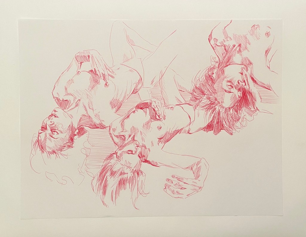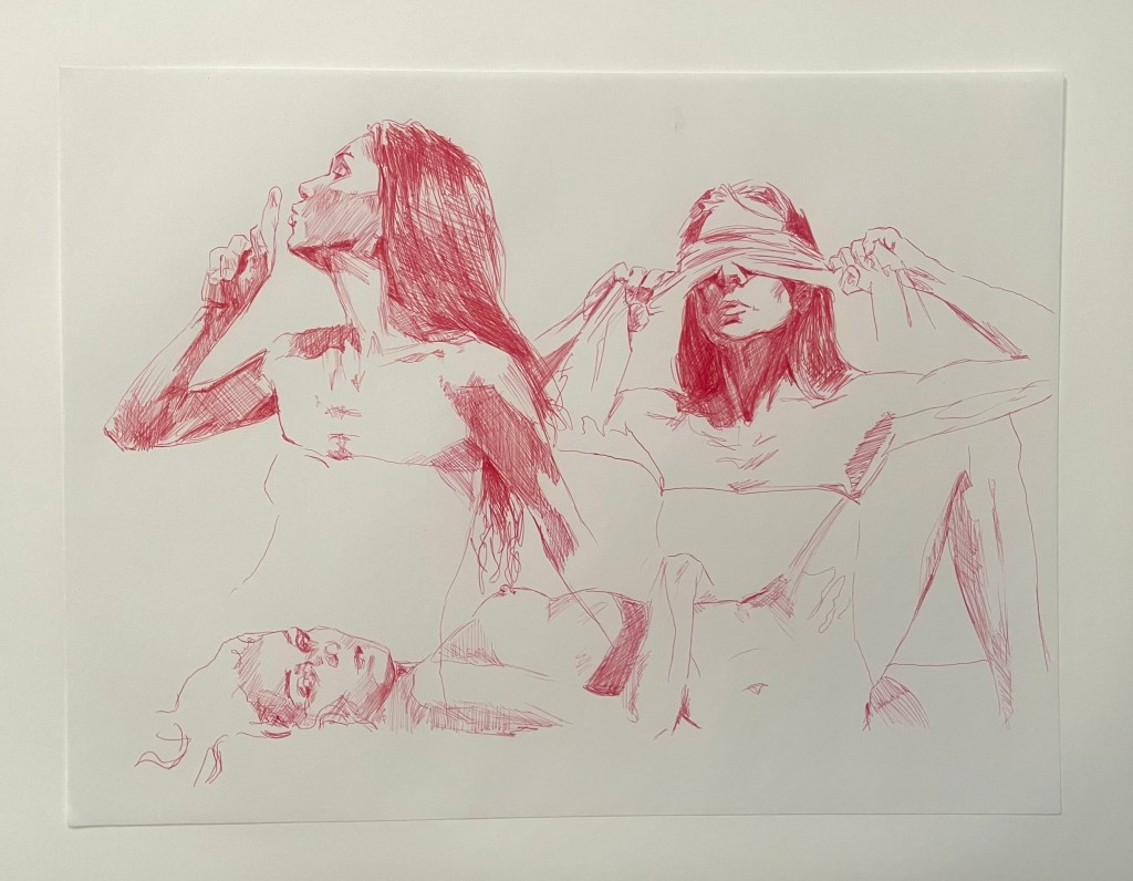Alla teckningar nedan är utförda med kulspetspenna. De var svåra att fota så en del kan skifta lite i ton men alla är tecknade på ett vitt papper med röd, lila eller rosa penna.