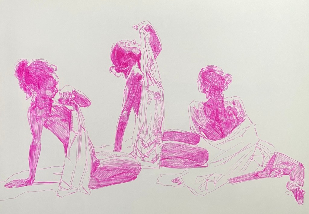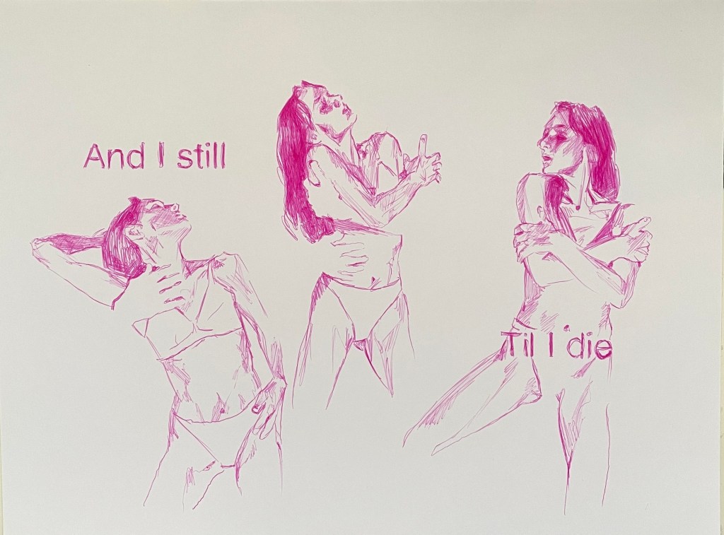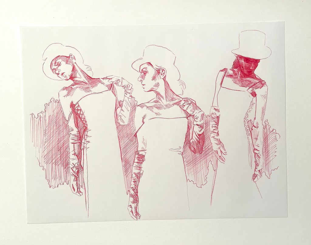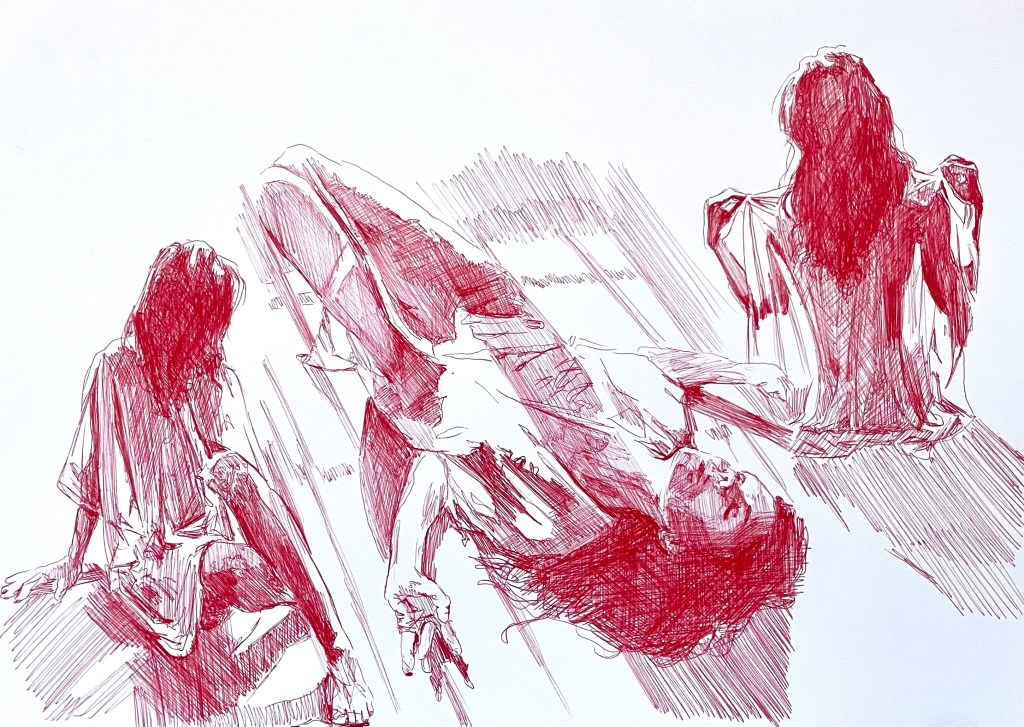 Alla teckningar nedan är utförda med kulspetspenna. De var svåra att fota så en del kan skifta lite i ton men alla är tecknade på ett vitt papper med röd, lila eller rosa penna.