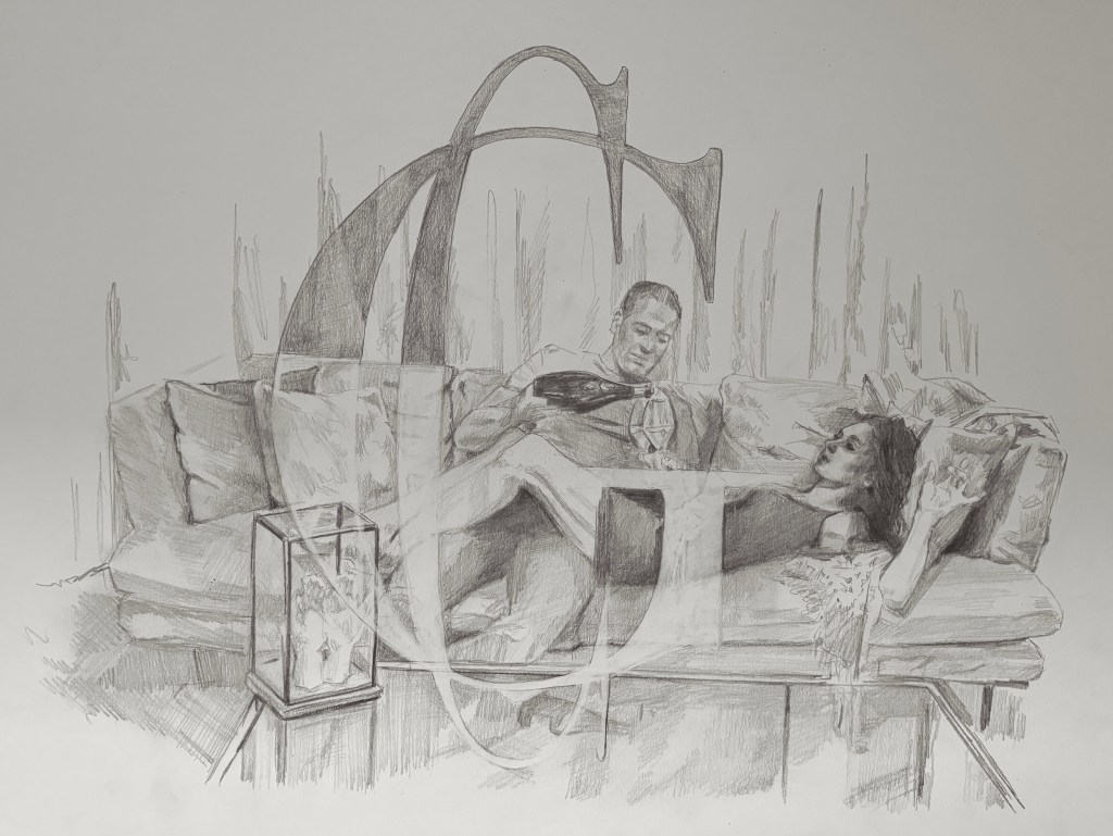 Teckningar utförda i blyerts och akryl på papper. De tillhör en serie teckningar och målningar som jag kallar Historisk eklekticism. Vill du se fler i denna serie hittar du dem under fliken ”målningar till salu”. Jag älskar kontrasterna som uppstår när jag blandar olika historiska element. De är så roliga att utföra.